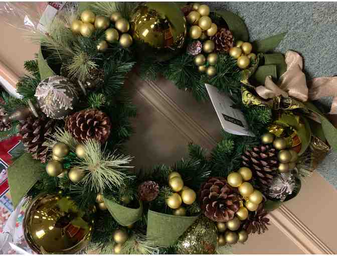 A beautiful, hand-crafted wreath, complete with large statement ornaments, beautful green and silvery ribbon, and delicate pine cones. A breathtaking statement piece for any entranceway, foyer, or above the fireplace.
