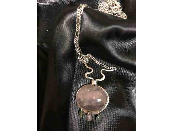 Rose quartz oval mounted in graceful sterling silver setting with small hanging gemstones. 18" silver chain.