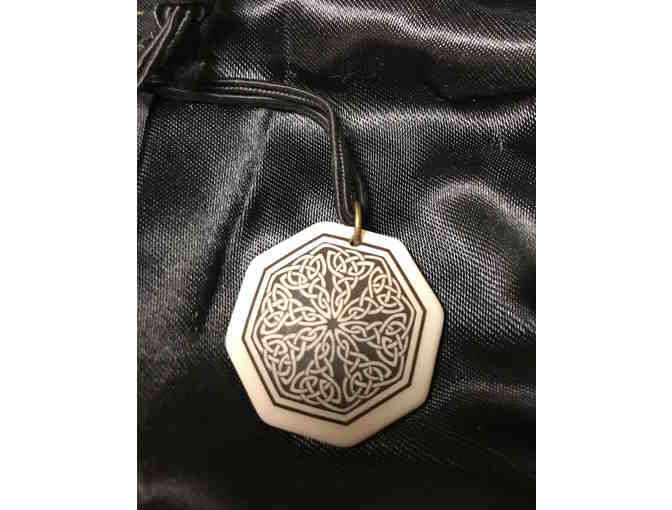 Porcelain pendant with Celtic design suspended on cord. Made by Touchstone Pottery.