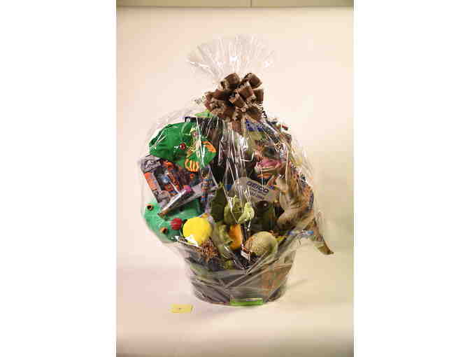 This basket is as big as a dinosaur! The package is filled with dinosaur toys, including a Discovery T-Rex that comes alive with sound, an IGBY the Iguana Stuffie, Jurassic World pop-up game and stationary set, and many other dinosaur themed toys in a large tub to store everything.