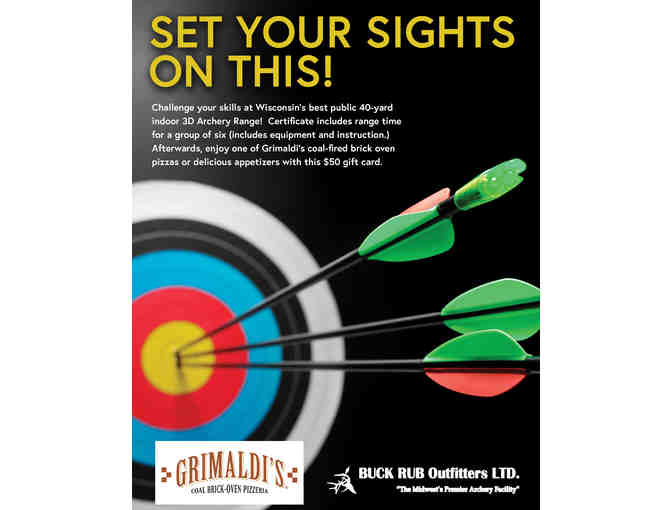 Challenge your skills at Wisconsin's best public 40-yard indoor 3D Archery Range! Certificate includes range time for a group of six (includes equipment and instruction.) Afterwards, enjoy one of Grimaldi's coal-fired brick oven pizzas or delicious appetizers with this $50 gift card. Buck Rub certificate expires April 2019