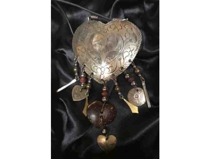 Gorgeous design on metal heart from which dangles an array of hearts and trinkets. 2 1/4" x 4". Cord is 22" long and can be adjusted.