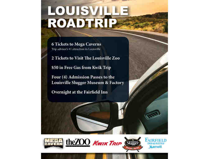 Take a road trip to Louisville and experience everything this vibrant city has to offer. First, we'll give you $50 in free gas from Kwik trip to get there. Then settle in for an overnight at the Fairfield Inn. While in Louisville, visit the Louisville Slugger Museum & Factory (4 admission passes) and the Louisville Zoo (2 admission passes, not valid for after-hours events). And of course, check out the MEGA Cavern, Trip Advisor's #1 attraction in Louisville, featuring the world's only fully underground zip lines (MEGA ZIPS), the world's only fully underground aerial ropes challenge course (MEGA QUEST), a 10-stories underground historic tram tour (MEGA TRAM), the largest indoor bike park in the world (MEGA BIKES), and many other adventure tours. We're giving you 6 different tickets to the MEGA Cavern and also includes Lights Under Louisville, the world's only fully underground holiday lights show.