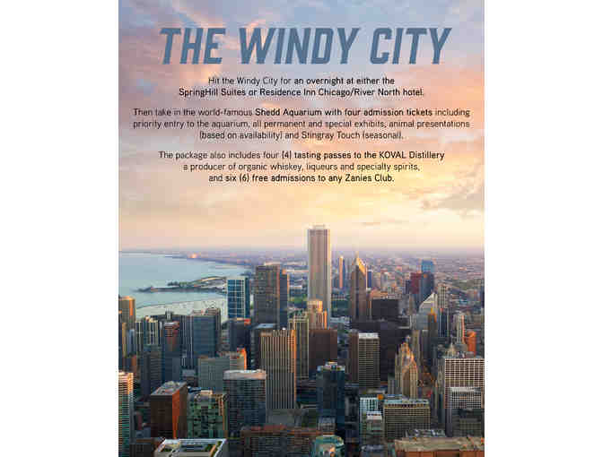 Hit the Windy City for an overnight at either the Spring Hill Suites or Residence Inn Chicago/River North hotel. Then take in the world-famous Shedd Aquarium with four admission tickets including priority entry to the aquarium, all permanent and special exhibits, animal presentations (based on availability) and Stingray Touch (seasonal). The package also includes four (4) tasting passes to the KOVAL Distillery a producer of organic whiskey, liqueurs and specialty spirits, and six (6) free admissions to any Zanies Club (not valid Saturdays or special events, $2 service fee upon entry, two item minimum and reservations required. Bearer must be 21 and older.)