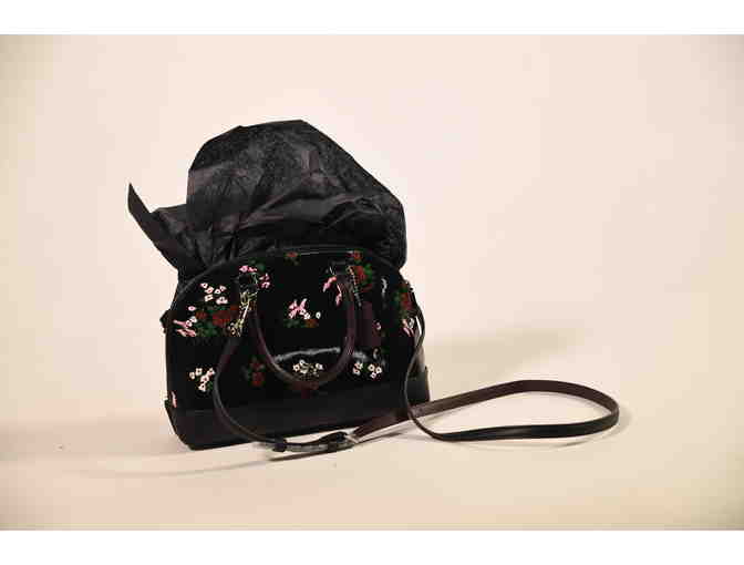She will adore this Coach patent black mini Sierra purse with beautiful floral print. The bag features a zip closure, double handles, adjustable and removable long strap, and Coach metal logo