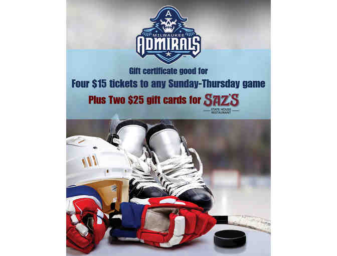 Check out the Milwaukee Admirals with four (4) $15 tickets to any Sunday-Thursday game – and then head over to Saz's for dinner with these two (2) $25 gift cards.