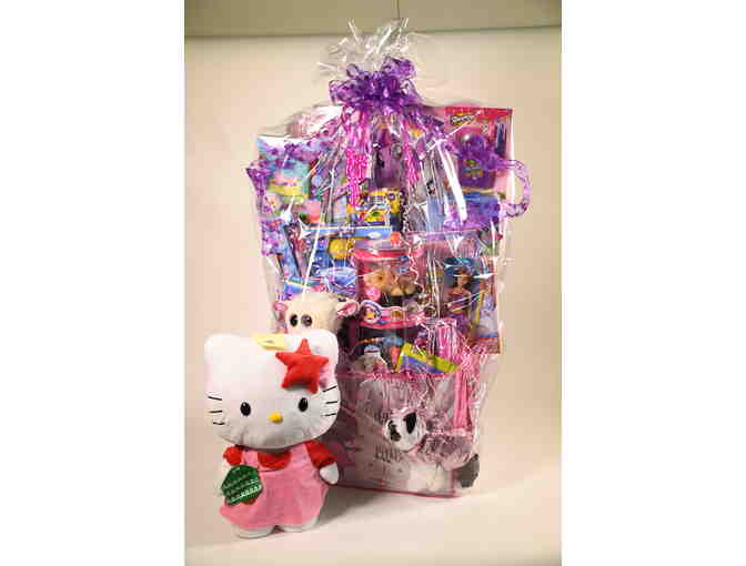 Your little princess will love this mega basket of toys including the teacup piggie, Miss Kitty large stuffed toy, playland ball playset, Barbie doll, games, sticker books, paints, doggie purse, shopkins, and many more little girl themed toys and candy.