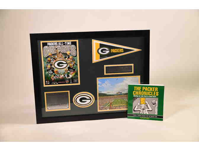 Show off your love for all things Green and Gold. This framed Packer Memorabilia Plaque also includes a $20 gift certificate to Master Z's, and a copy of The Packer Chronicles - A series of editorial cartoons by Lyle Lahey