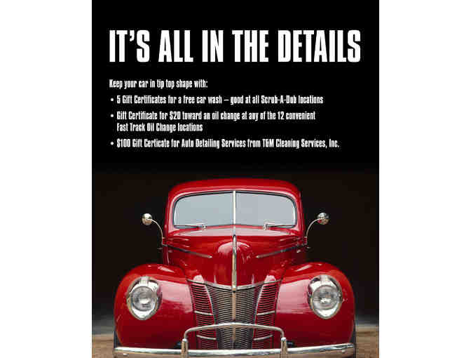 Keep your car in tip-top shape with five (5) Gift Certificates for a free car wash - good at all Scrub-A-Dub locations, a gift certificate for $20 toward an oil change at any of the 12 convenient Fast Track Oil Change locations, and $100 gift certificate for Auto Detailing Services from T&M Cleaning Services, Inc.