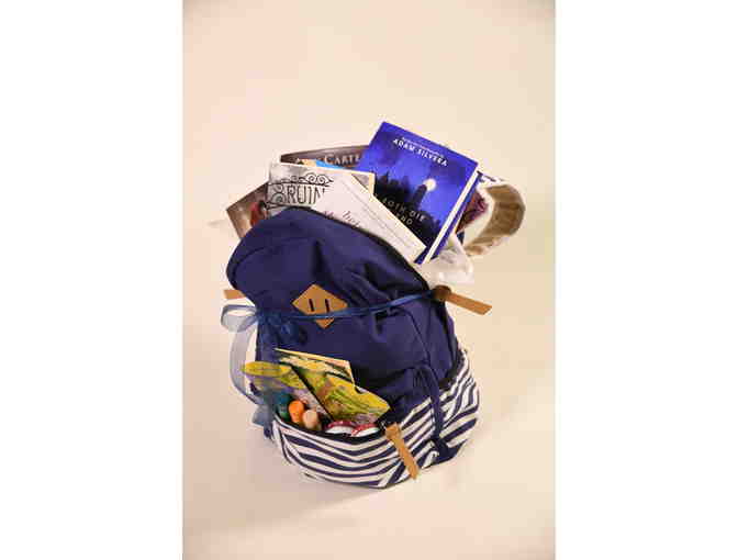 This striped blue backpack if filled with favorite YA books, including "Heist Society," "They Both Die at the End," and "Between Shades of Gray." We've also included two journals and a selection of certified organic & 100% natural body care from Badger Balm.