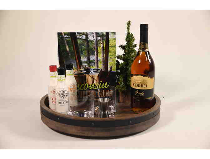 Bring the Supper Club home! This package includes a Wisconsin Supper Club hard cover book, bottle of brandy, three types of bitters, old-fashioned glasses, and a stainless steel jigger - all nestled on a vintage lazy susan.