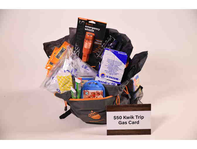 This 2-Person 72-hour Emergency Kit comes in a sturdy backpack and includes: two 3600-calorie Datrex Bars, 12 Datrex water pouches, a 45 piece first aid kit, 2 emergency blankets, 4 body and hand warmers, a 13-function knife, a 5-1 survival whistle, two green 12-hour light sticks and a tissue pack. We've added a $50 Kwik Trip gas card to make sure you are ready for anything.