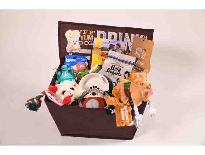 This basket was designed especially for the small dog under 20 pounds. It includes a heavy duty LazyBonezz storage bin filled with toys, treats, a fashion food mat, dish, collar, Chuck-it Tennis Balls, Lambchop toy and a special toy from Bark Box