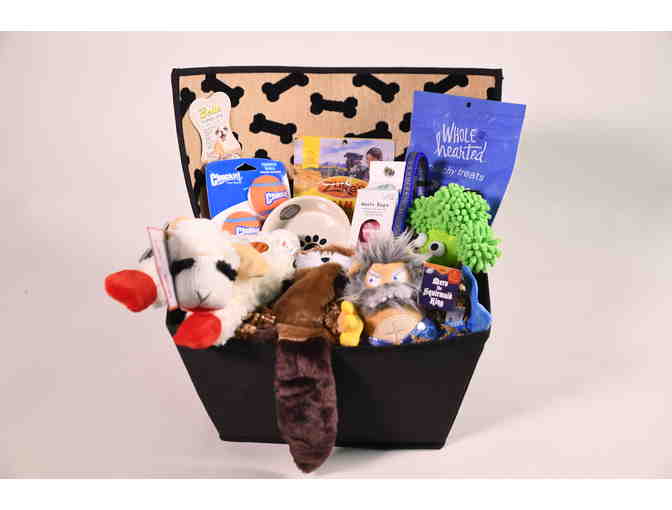 This basket was designed especially for the medium dog from 20-100 pounds. It includes a heavy duty LazyBonezz storage bin filled with toys, treats, a fashion food mat, dish, collar, Chuck-it Tennis Balls, Lambchop toy and a special toy from Bark Box