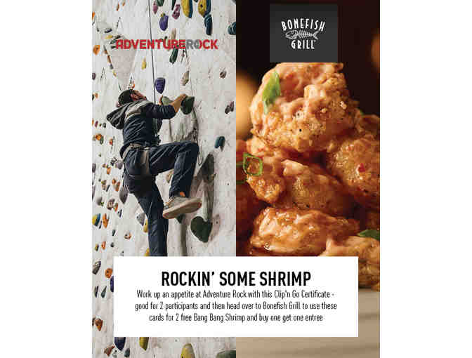 Work up an appetite at Adventure Rock with this Clip'n Go Certificate (good for 2 participants) and then head over to Bonefish Grill to use these cards for two (2) free Bang Bang Shrimp and a buy one, get one entree.