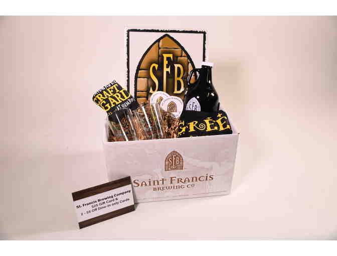 Have you checked out St. Francis Brewing Company with their heavenly food and sinfully good beer? This package includes a $25 gift card, St. Francis Brewing Co. tin bar sign, a growler, two (2) pint glasses, a Ladies (Small) "Craft Beer Garden" t-shirt, a Ladies (Large) "Greed" t-shirt, and two (2) $5 off dine-in-only cards.