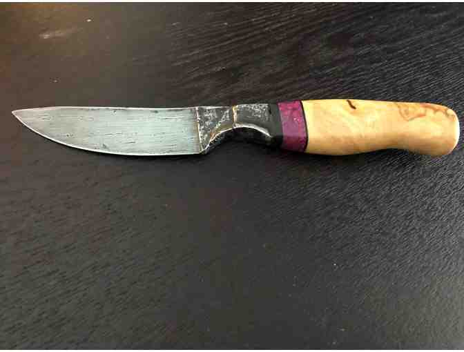 Made from a sheer steel blade salvaged from a horse buggy spring that was found on North Branch School's property. The handle is from a burl that was also discovered on school grounds. It has a stabilized handle with a dyed purple burl spacer. Also has a forged integral finger guard.