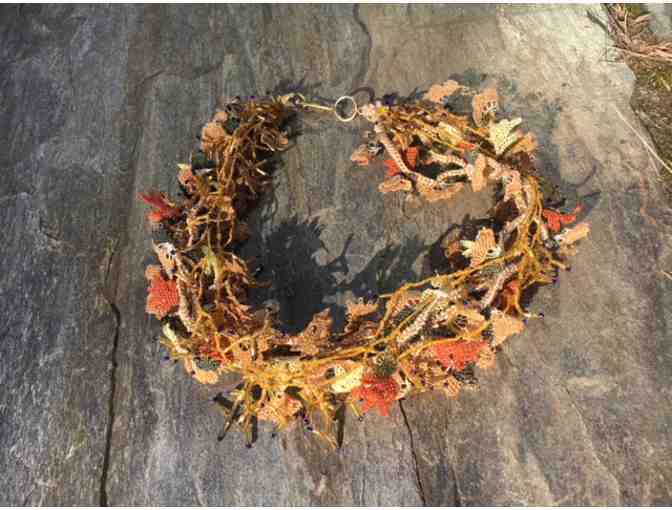 A magical necklace from Italy. Made from various colors of silk chord and glittery gold and blue beads. Beads catch the light and glisten.