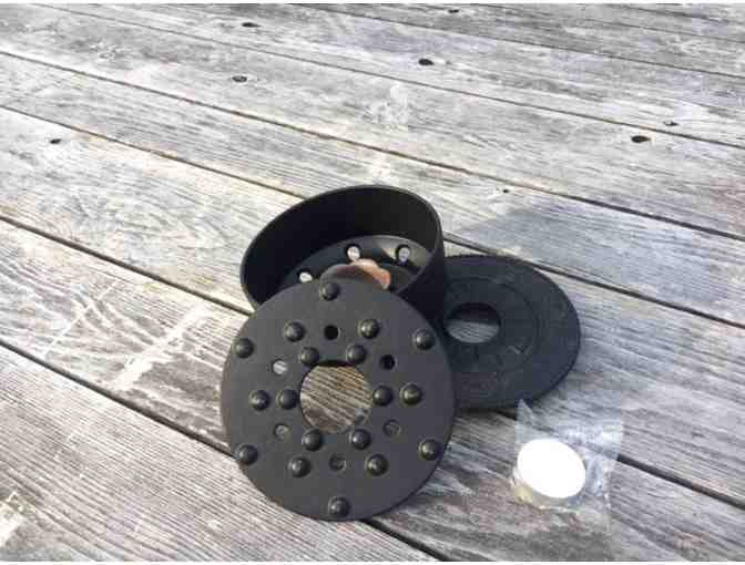 Keep your tea hot this winter with this functional, weighty, and elegant accessory. The trivet, with its unique design, can be used either as an addition to the warmer or separate to spare your table. Adorable iron lotus blossom holds the tea candle and catches wax. Purchased at Stone Leaf Tea House in Middlebury and donated by our own Mia Allen.