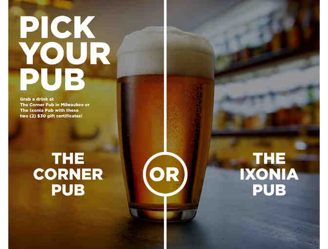 Grab a drink at The Corner Pub in Milwaukee or The Ixonia Pub with these two (2) $30 gift certificates!