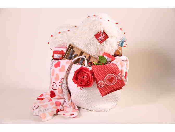 Someone will heart you when you give them this basket featuring a faux fur heart pillow, oversized 5' x 6' plush throw, two rose scented candles, a bottle of 99 Barrels wine, kiss sign, heart lights, and more.