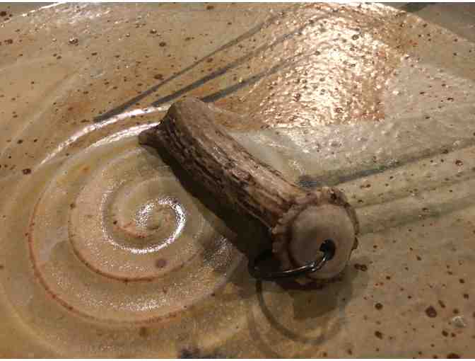 Keep track of your keys with this authentic key chain. Antlers are white tail sheds that have been designed, cut, sanded, and posihed all with care by Ripton resident Bucky Doria. 4.25'' long and 1.25'' at the widest