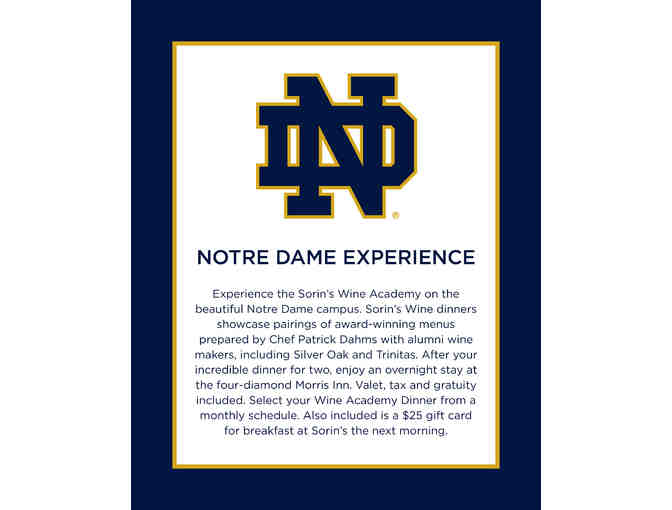Experience the Sorin’s Wine Academy on the beautiful Notre Dame campus. Sorin’s Wine dinners showcase pairings of award-winning menus prepared by Chef Patrick Dahms with alumni wine makers, including Silver Oak and Trinitas. After your incredible dinner for two, enjoy an overnight stay at the four-diamond Morris Inn. Valet, tax and gratuity included. Select your Wine Academy Dinner from a monthly schedule. Also included is a $25 gift card for breakfast at Sorin's the next morning.