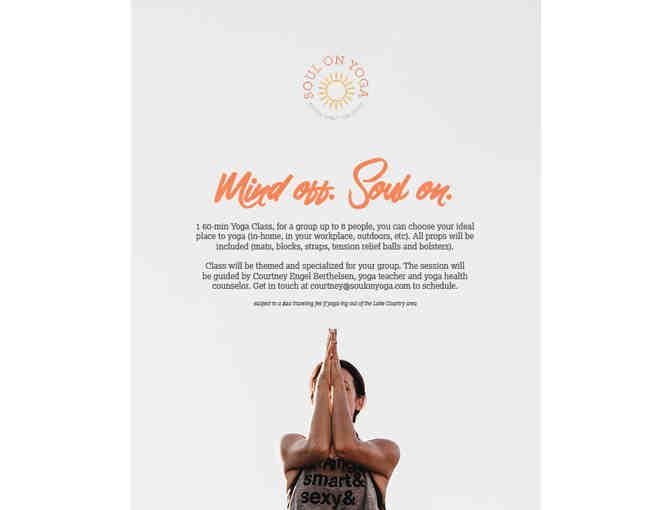 "Clear your mind with this 60-min group yoga class for up to 8 people. Choose your ideal place to yoga (in-home, in your workplace, outdoors, etc). All props will be included (mats, blocks, straps, tension relief balls and bolsters).