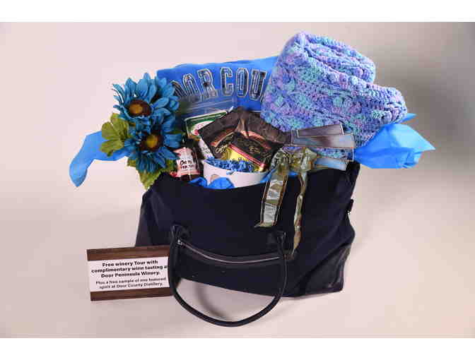 Cuddle up in this Door County Hoodie (Ladies M) and beautiful hand crocheted blanket. Enjoy other favorites from the Door Peninsula: Door County Cherry Preserves, Cherry Berry Nut Mix, Door County Coffee & Tea Co. Vanilla Cappuccino and Country Morning Blend and artisan crafted stained glass. Or take a ride and enjoy a free winery tour with complimentary wine tasting at Door Peninsula Winery. Plus a free sample of one featured spirit at Door County Distillery.