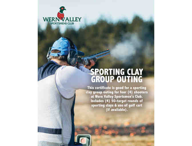 This certificate is good for a sporting clay group outing for four (4) shooters at Wern Valley Sportsmen's Club. Includes (4) 50-target rounds of sporting clays & use of golf cart (if available).