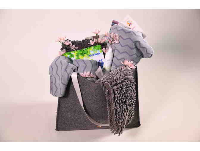 This bath essentials kit includes a limited edition spa bath matt, two (2) large chevron body towels, two (2) chevron hand towels, two (2) chevron body cloths, a chenille hand towel, body scrub mitt, travel size peppermint foaming hand wash, and a 1/2 size bag of laundry detergent.