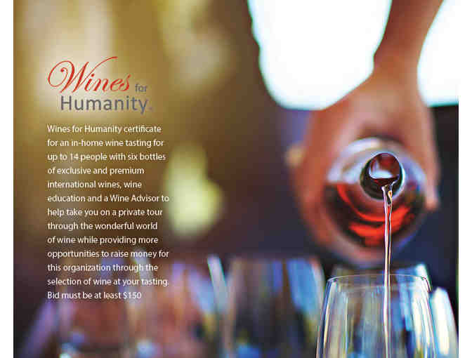 This Wines for Humanity certificate is good for an in-home wine tasting for up to 14 people with six bottles of exclusive and premium international wines, wine education and a Wine Advisor to help take you on a private tour through the wonderful world of wine.