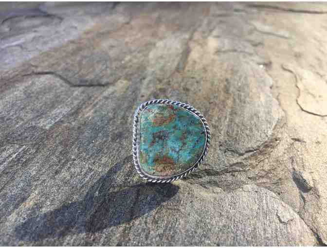 Lovely rare green turquoise stone with sterling silver braid surround.