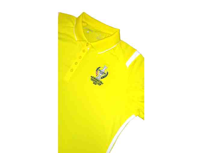 This Antigua "Merit" style golf shirt is yellow with white trim along the sides and collar. While the logo implies it's made for an American audience, yellow was one of Europe's colors that year, so it's suitable no matter which side you were rooting for!