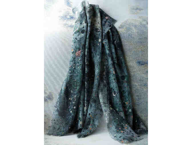 Bid on a galaxy of paint splatters that grace his 'Drop Cloth' silk and cashmere scarf. The inky base is dotted with drops of pale pink, cream and deepest green. The Italian made scarf is finished with raw edges.
