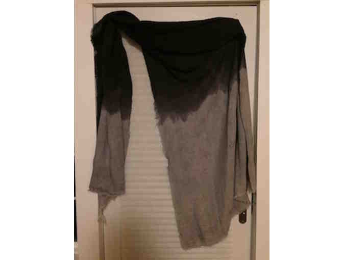 Bid on an oversized black and gray ombré linen scarf. Naturally dyed open weave linen with raw edge micro fringe on all sides.