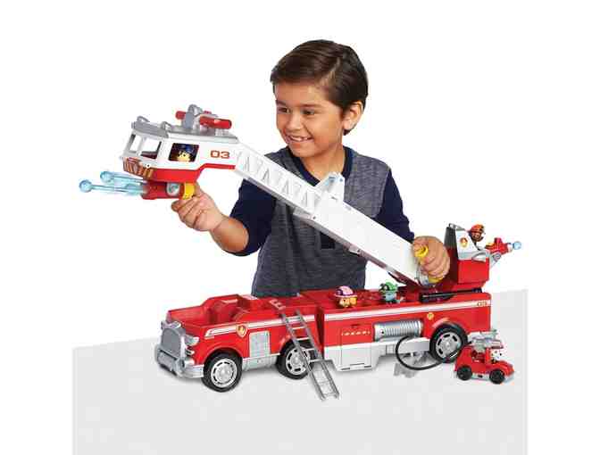 An ultimate rescue needs an ultimate vehicle! Save the day with Marshalls Ultimate Rescue Fire Truck! This vehicle is equipped with an extendable 2 ft. tall ladder, flashing lights and sounds its ready for anything! To activate, simply lift and pull! The adventure begins with Marshall (figure included) in the lookout cab. Lift open the top to help Marshall leap into action! Using the water cannon launcher at the bottom of the cab, you can send up to three water cannons (included) flying into the fire! When Marshall needs a helping paw, theres room for all six pups (not included) aboard this fire truck! With Skye behind the wheel and Zuma operating the water cannon at the back of the truck, Marshall can hop into the Mini Fire Cart! Stored inside the fire truck, the Mini Fire Cart rolls right into action! The Ultimate Fire Truck also features a mini fire hose for small missions. When you and Marshall spot a baby animal in trouble, use the extendable working claw arm to pick them up and lift them to safety. Take the pups on exciting new adventures with the Ultimate Rescue Fire Truck!
