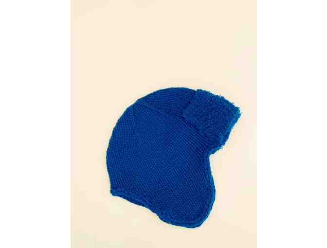 This majorelle blue trapper hat is four ply, hand knit, and 100% cashmere from Armand Diradourian.