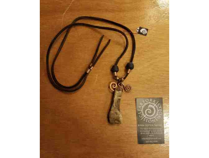John Steven Kjome's "Oneota Primitives" jewelry is made from his beach pebble pickings on the Upper Iowa river (Oneota), combined with hand forged copper, African glass beads, and leather lace. The stones are river tumbled limestone and other materials that are 450-500 million years old (Ordovician).