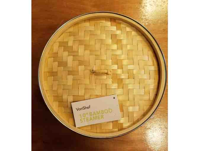 VonShef Premium 2 Tier Bamboo Steamer with Stainless Steel Banding Includes 2 Pairs of Chopsticks and 50 Wax Steamer Liners, Perfect For Steaming Dim Sum Dumplings Buns Vegetables Fish Rice, 10 Inches