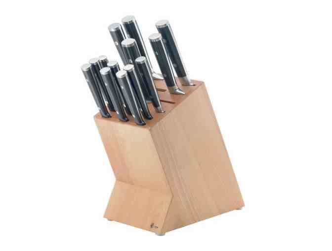 Looking to up your cooking game? These Gordon Ramsey Knives and Block are a great addition to your kitchen! This 14 piece knife block set includes (1) paring knife, (1) utility knife, (1) bread knife, (1) carving knife, (1) Cooks knife 20cmn, (1) Cooks knife 5cm, (1) sharpening steel, (6) steak knives, (1) wooden knife block.