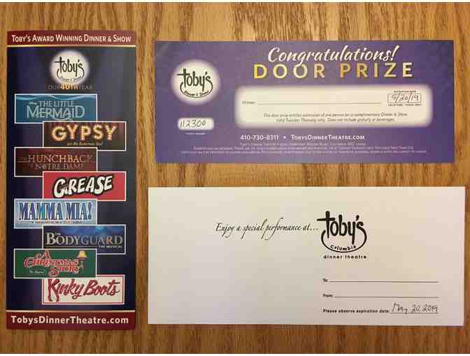 Certificate from Toby's Dinner Theatre for admission for one person for a complimentary dinner & show. Valid Tuesday - Thursday. Does not include gratuity or beverages. Expires 5/20/19.
