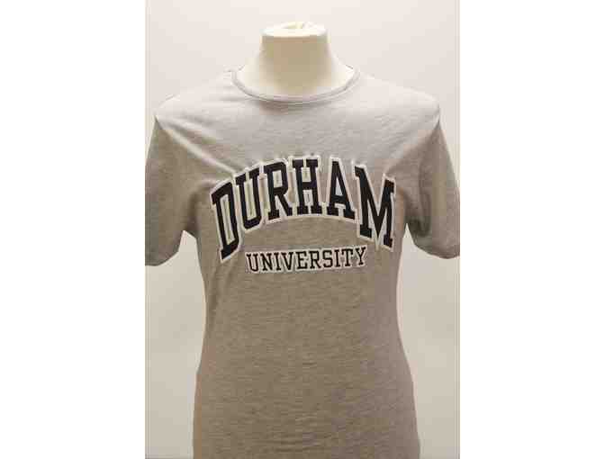 Our new Durham University t-shirt has a drop tail and centre back seam with the Durham University logo printed in navy and outlined in white.