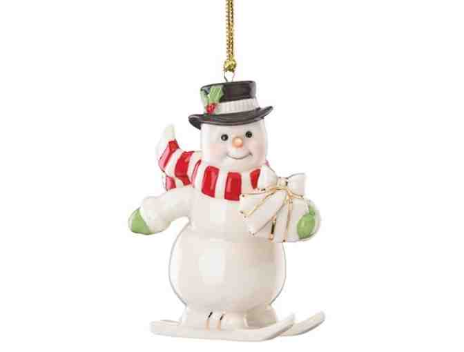 Wearing a bright red scarf and making his way on skis, the Downhill Snowman Ornament is preparing to deliver a specially wrapped gift. Crafted in shimmering porcelain, hand-painted, and accented in gold, this sweet ornament makes a great gift.