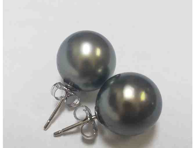 11mm Natural Black Tahitian Black Pearl Studs courtesy of Tara Gray Fine Jewelry. AAA Excellent Quality, 14KT White Gold, and certificate of authenticity.