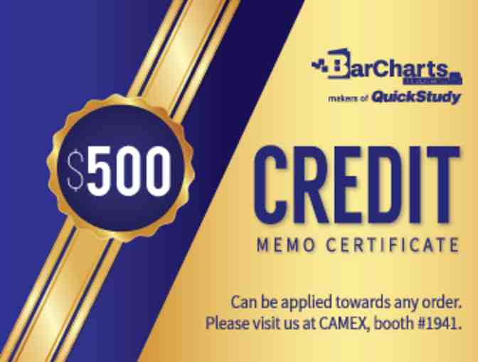 Don't miss this opportunity to get the quick-reference materials that help your students succeed with a $500.00 BarCharts Credit Memo. Can be applied towards any order.