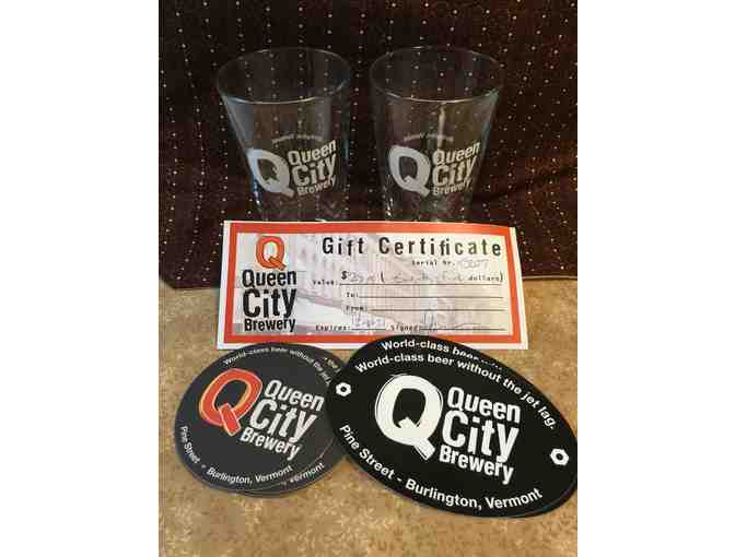 Queen City Brewery $25 gift certificate, 2 pint glasses, and some QCB stickers and coasters.