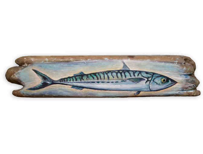 Oil painting of a mackarel on driftwood. 16.5 inches long.