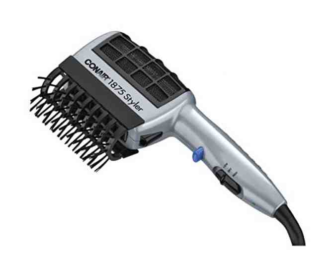 Includes 3 attachments to achieve a variety of looks and styles: 1 styling comb for smooth and straight styles, 1 bristle brush for volume and waves, 1 detangling comb for easy styling. Ionic Technology for shiny-looking hair and less frizz. 2 Heat / Speed settings. Cool Shot locks style in place. Dual Voltage - great for travel. 5.5 foot cord. Hinged Filter prevents lint buildup, extending motor life.