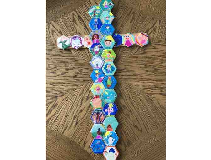 1st Grade Cross. This lovely wall-hanging cross is made up of beautifully decorated ceramic tiles by the 1st grade class. This cross measures 24"x 14".You'll want to be the winner of this priceless piece of 1st grade! Come take a look in the school lobby! This item closes on Thursday at 10pm.